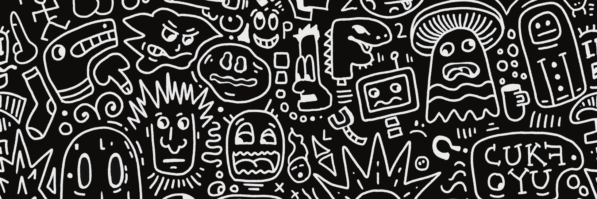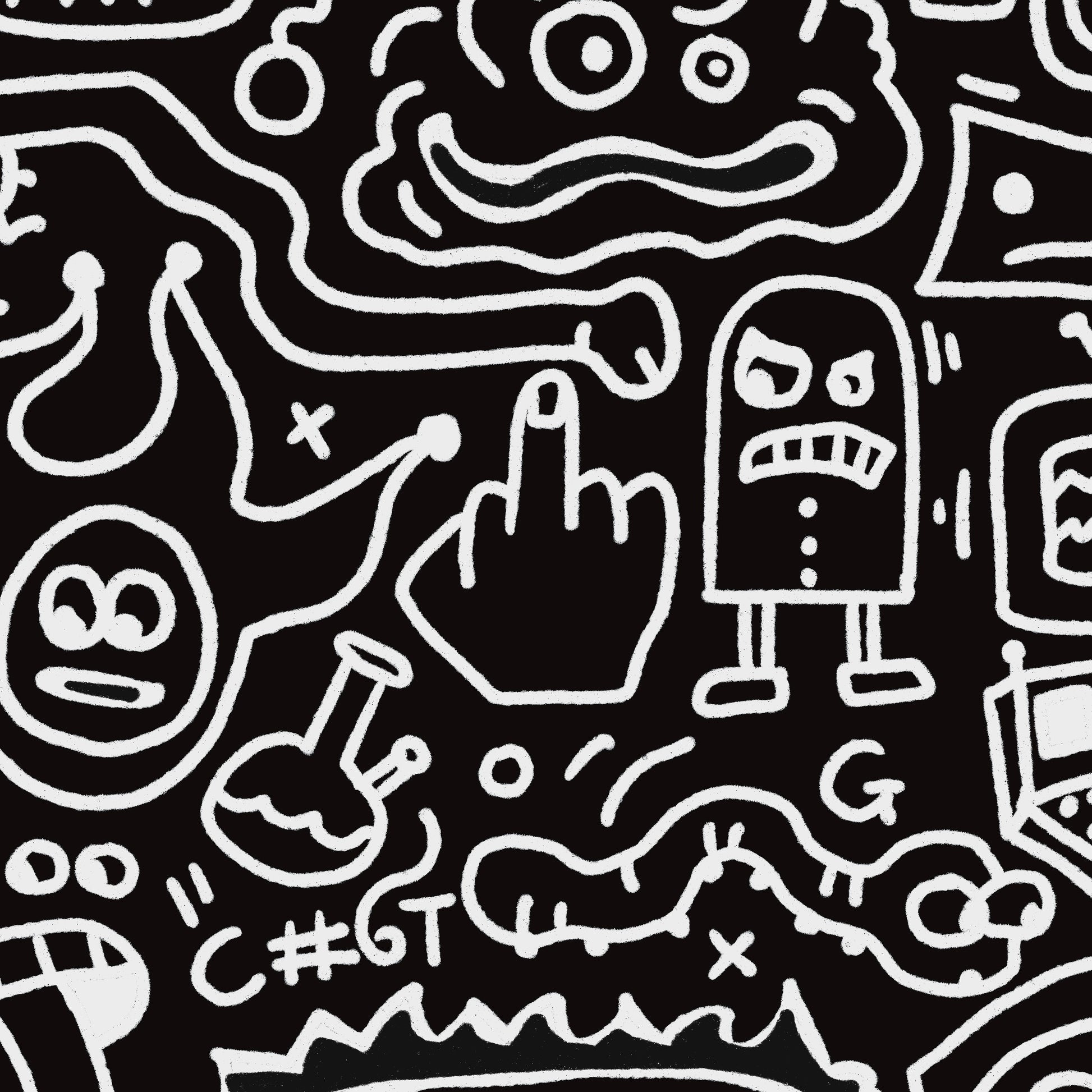 Look closer? You’ve entered a chaotic brain dump with no exit strategy. Ghosts, glitches, eyeballs, bones, rogue office supplies, and whatever that thing near the clock is. Oh yeah, and dicks…