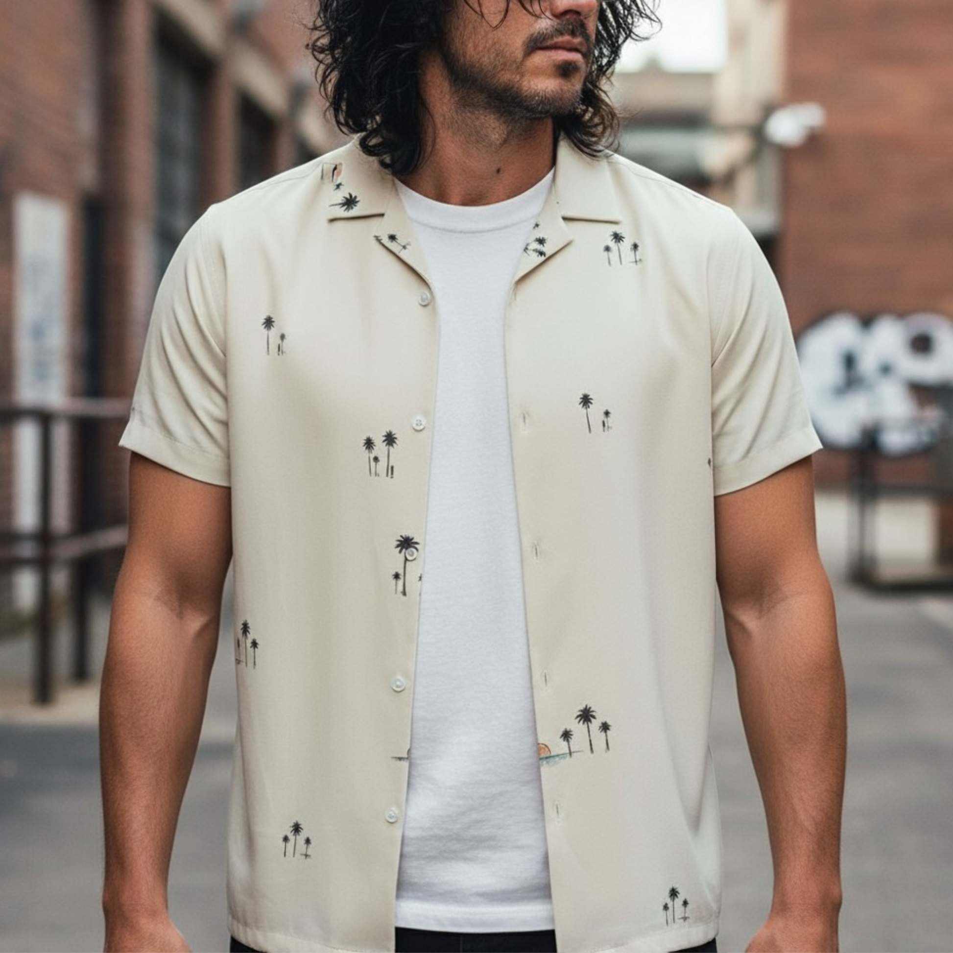 From a distance, it’s just your classic breezy island scene—palm trees, a glowing sun, and easy vibes all around. But look closer, and you’ll find a tiny figure leaning casually against a tree, taking the edge off the day in his own mysterious way. This shirt captures the golden-hour calm with just a hint of mischief hiding in the details.